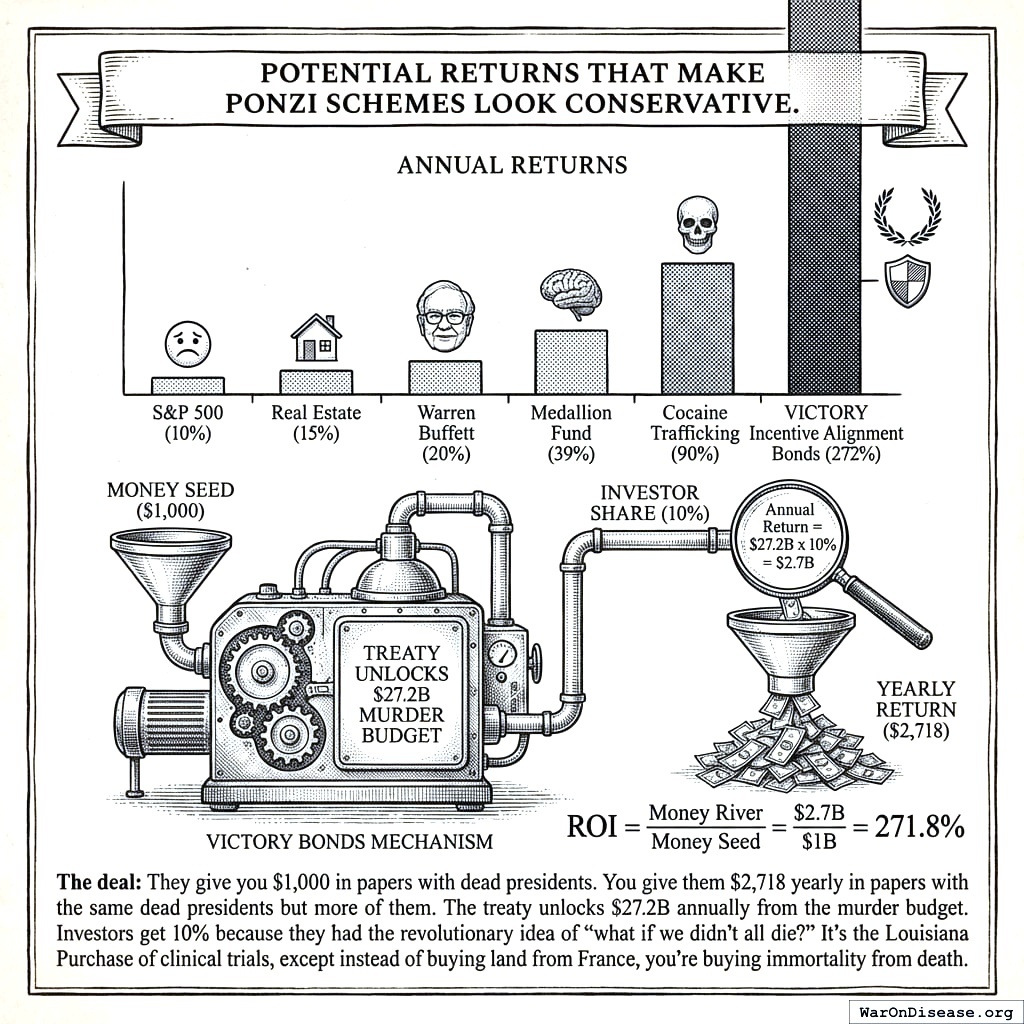 Here’s how, in three sentences: Sell Incentive Alignment Bonds146 that raise $1 billion to legally bribe politicians (via Super PACs and lobbying) into signing a treaty that redirects 1% of military spending to clinical trials. Of the resulting $27.2 billion/year, 80% funds trials, 10% pays investors 272% annual returns, and 10% funds a Super PAC that rewards politicians who voted yes. Returns grow in proportion to the treaty percentage, so every billionaire bondholder becomes a permanent lobbyist for expanding it, creating self-sustaining pressure to reallocate from death to life.