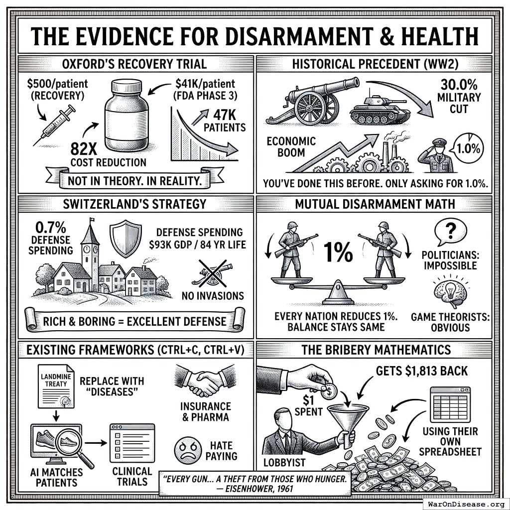 Your species spends 604 (95% CI: 453-894) times more on weapons than on testing which medicines work. Given your governments have cut military spending by 87% before and signed multiple global treaties, is it physically possible they’d redirect 1%? Would increasing clinical trial capacity by 12.3x (95% CI: 4.2x-61.4x) help find treatments faster? Would fewer sick humans save lots of money from reduced healthcare costs? Do healthy people work and produce more? Would more productive humans and lower healthcare costs compound and give everyone more money over time? Do billionaires like money? Do billionaires prefer not dying of horrible diseases? Can billionaires use money to make politicians do things? Would nearly every human be better off in a world with less war and disease? Do humans like to be better off? If there was a plan that cost $1 billion to achieve all of this, is it possible one of your 2,781 billionaires might do it?