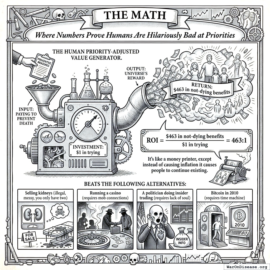 150 thousand humans permanently stop every 24 hours from diseases that are basically just bugs in your meat software. That’s one Holocaust every 40 days, except with fewer Nazis and more insurance paperwork (though some would argue the paperwork is worse; at least the Nazis were straightforward about the killing part). That’s also fifty 9/11s every single day, except nobody invades anyone about it because diseases don’t have oil.