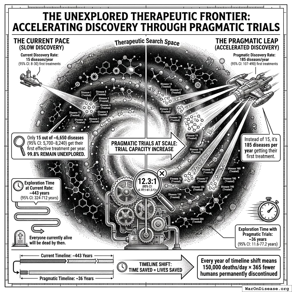 Only 15 diseases/year get their first treatment each year. With 6.65 thousand diseases lacking effective treatments, the backlog would take 443 years to clear. Integrating pragmatic trials into standard healthcare increases trial capacity 12.3x, cutting that timeline from 443 years to 36 years. The average untreated disease gets a treatment 212 years earlier, saving 10.7 billion deaths at $0.842 per year of healthy life saved.