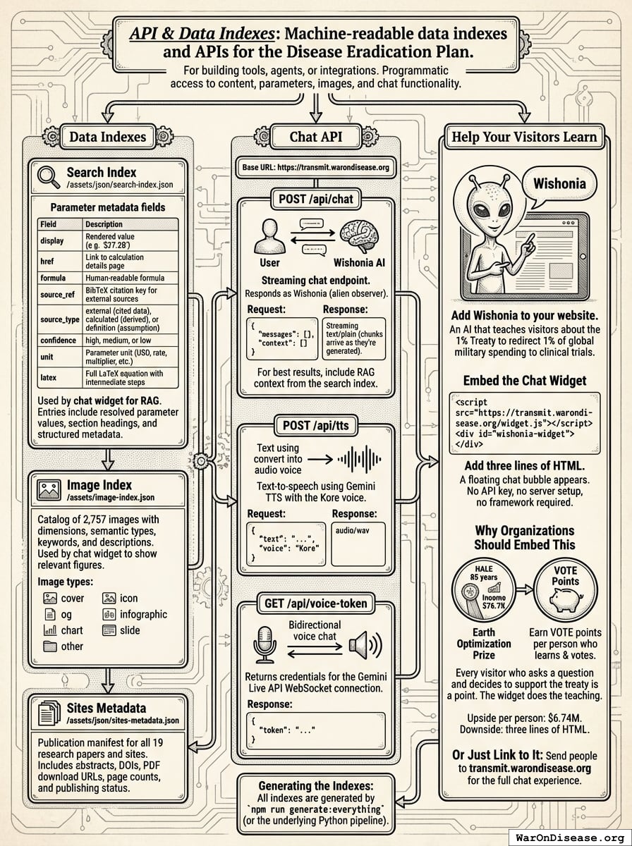 Wishonia is an AI that teaches your visitors about the 1% Treaty146, a plan to redirect 1% of global military spending to clinical trials. It answers questions, explains the math, cites sources, and shows relevant charts. Every conversation is one more person who understands how to end the largest unnecessary cause of death on the planet.