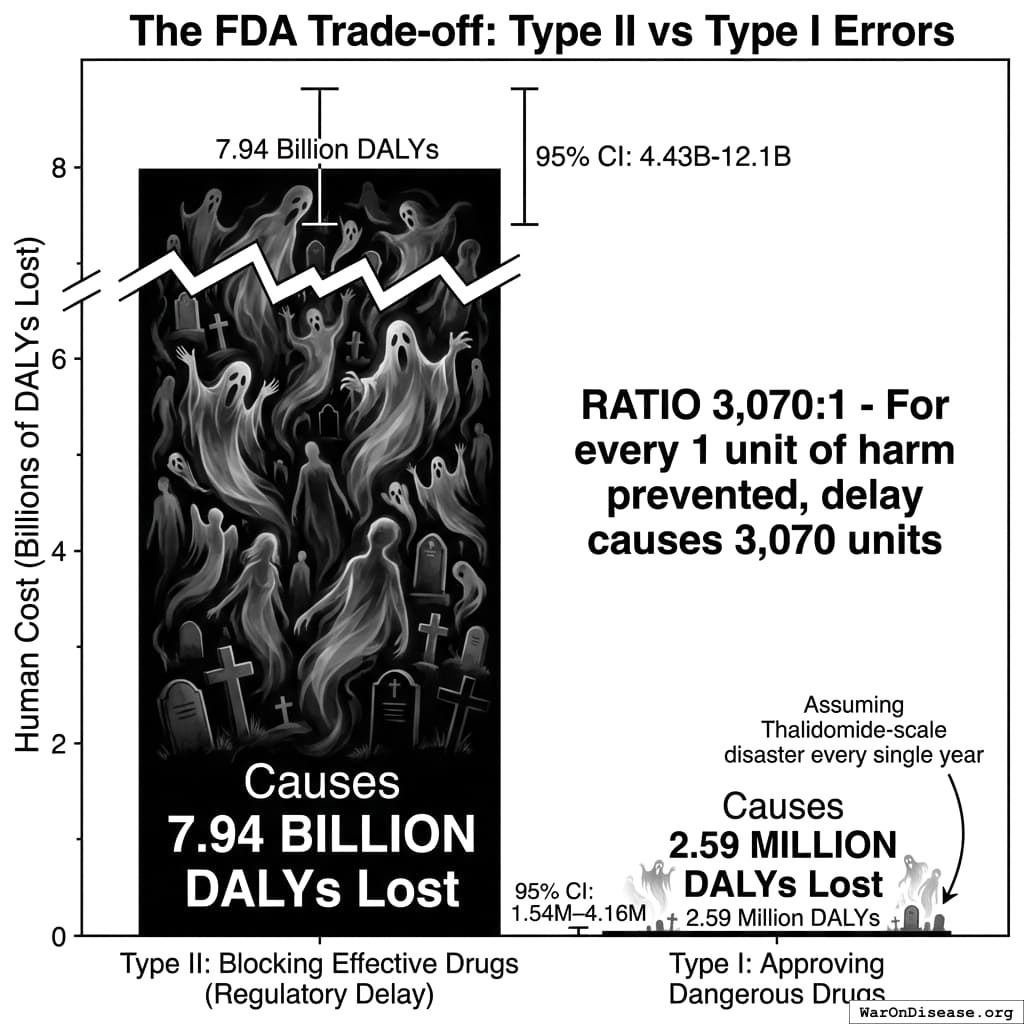 Valuing these lost years at a conservative global Value of a Statistical Life Year (VSLY) of $150,000 (95% CI: $100,000-$199,282)/DALY (the standard normative valuation used in WHO and health economics cost-effectiveness analyses), we find a cumulative economic deadweight loss of approximately $1.19 quadrillion (95% CI: $443 trillion-$2.41 quadrillion) (2024 USD). The study concludes that the societal cost of Type II Regulatory Errors (delayed access to effective therapies) exceeds the averted cost of Type I Regulatory Errors (market access for ineffective therapies) by a factor of 3,068 (95% CI: 2,878-3,125).