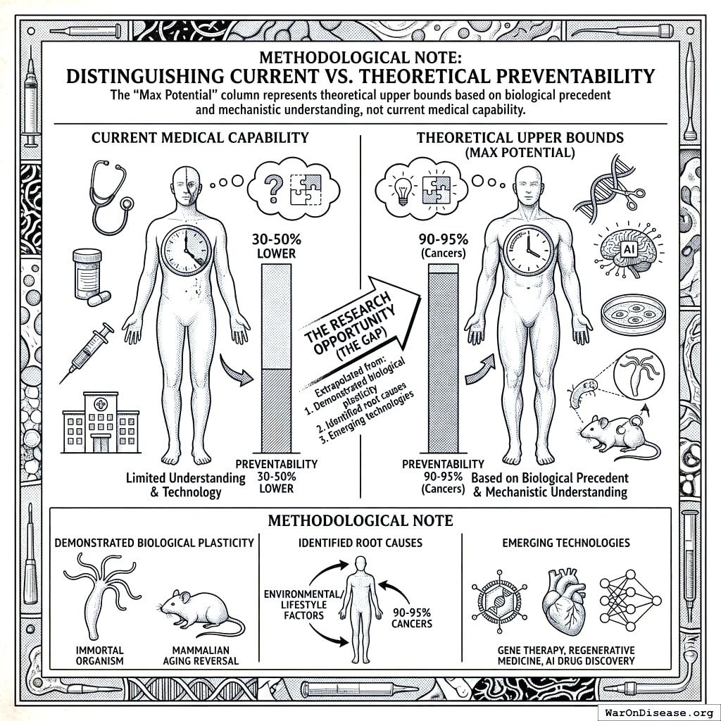 R3 paradigm: Rejuvenation (restoring cell function), Regeneration (stimulating repair), Replacement (substituting lost cells) Alzheimer’s: Stanford study showed stem cell transplants reduced brain abnormalities in mice; Neural Stem Cell Therapy shown to improve cognitive function and reduce amyloid plaques Parkinson’s: Clinical trial found Neural Stem Cell Therapy significantly improved motor function and was well-tolerated ALS/Huntington’s: MSC (mesenchymal stem cell) therapy effectiveness confirmed; slows ALS progression Challenge: Clinical trials often enroll patients at advanced stages; many preclinically promising drugs ineffective in late-stage human trials Current status: Largely experimental and early clinical trial stages; researchers working to overcome delivery challenges, safety concerns, and targeting widespread neuronal damage Note: 80% theoretical max for neurodegenerative reflects early-stage intervention potential; current treatments limited ( 10% effective) Additional sources: https://pmc.ncbi.nlm.nih.gov/articles/PMC7926761/ | https://med.stanford.edu/news/all-news/2023/09/stem-cell-alzheimers.html | https://stemcellres.biomedcentral.com/articles/10.1186/s13287-025-04285-7