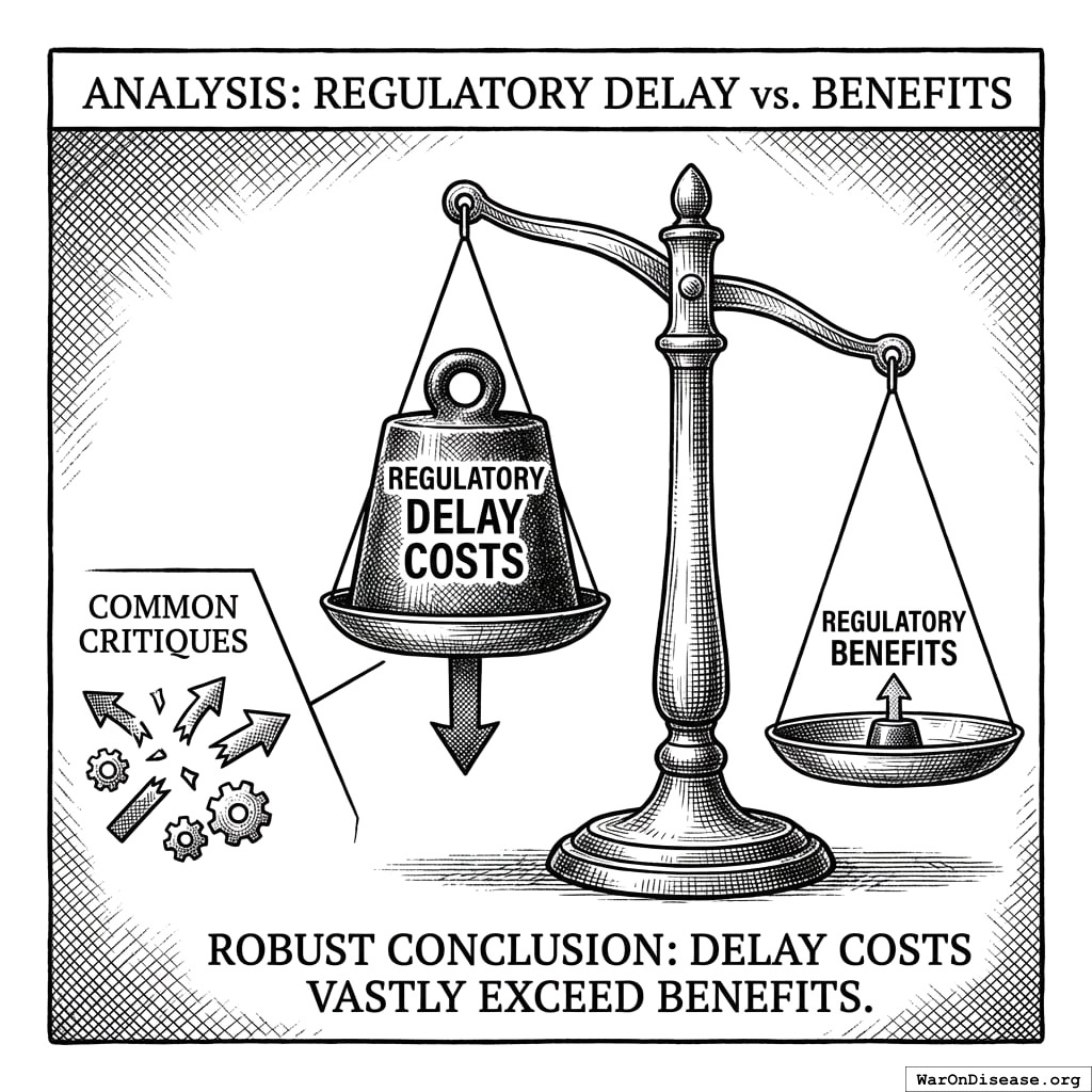 Gieringer148 synthesized these estimates, calculating 21,000-120,000 lives lost per decade from FDA delay. His work documented specific drug delays: propranolol (approved in the US 3 years after Europe for cardiac use, 10 years later for hypertension), interleukin-2 (7-year gap), and numerous other therapeutics.