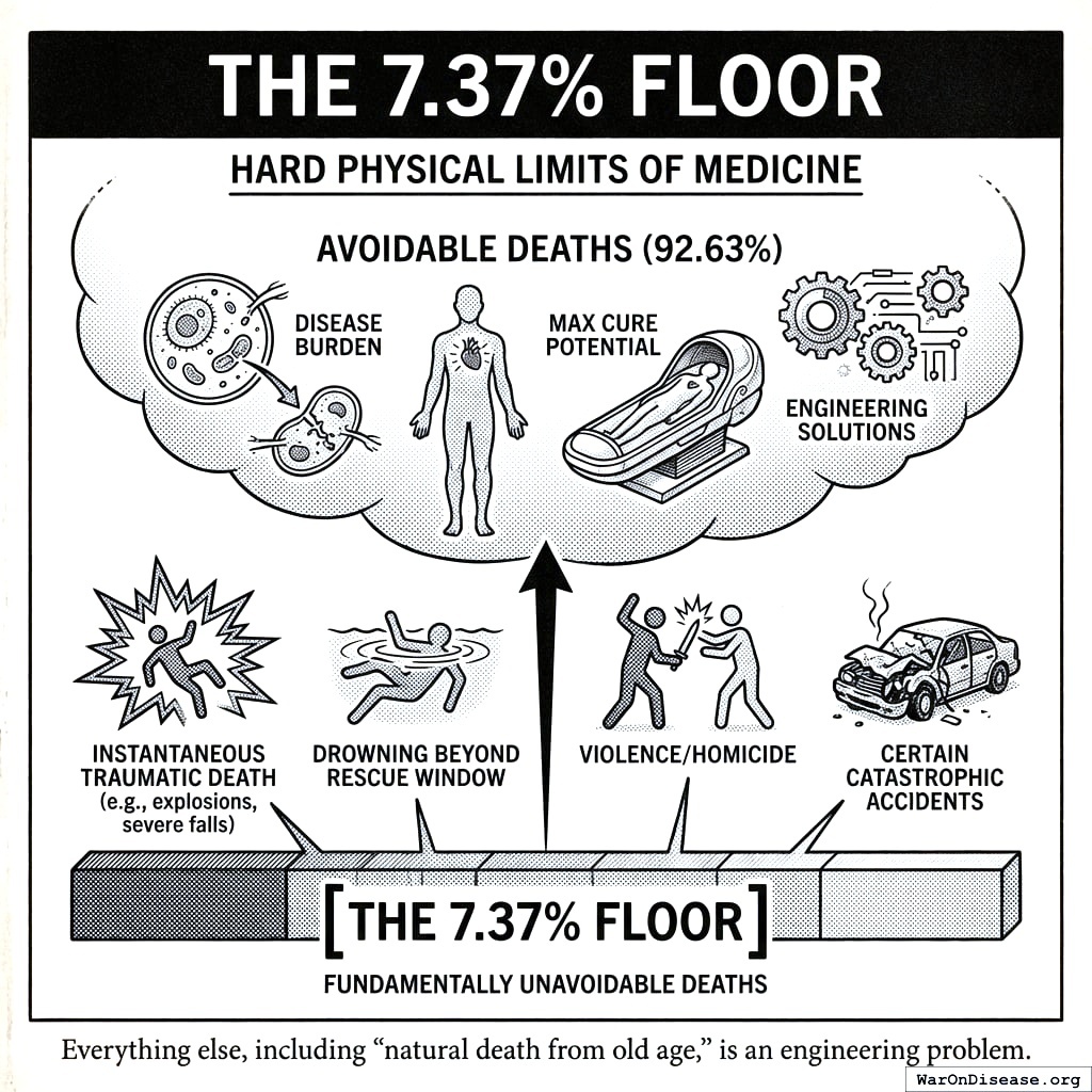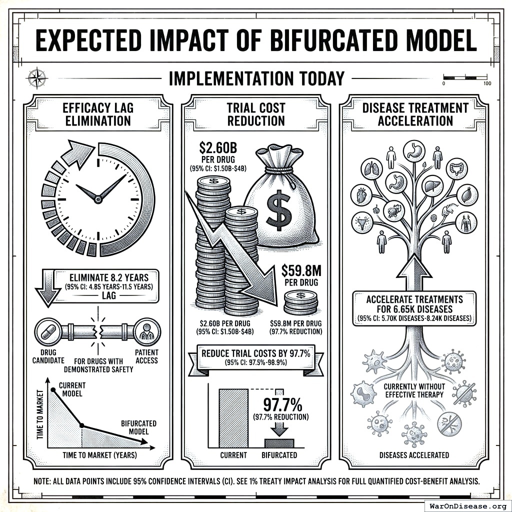 10.5281/zenodo.18161560 6.65 thousand diseases have zero FDA-approved treatments; at current trial capacity, exploring them takes 443 years. Redirecting 1% of military spending scales capacity 12.3x, cutting the timeline to 36 years and preventing 10.7 billion deaths. At $0.00177/DALY, 50.3kx more cost-effective than the best existing interventions. Incentive Alignment Bonds make adoption politically viable.