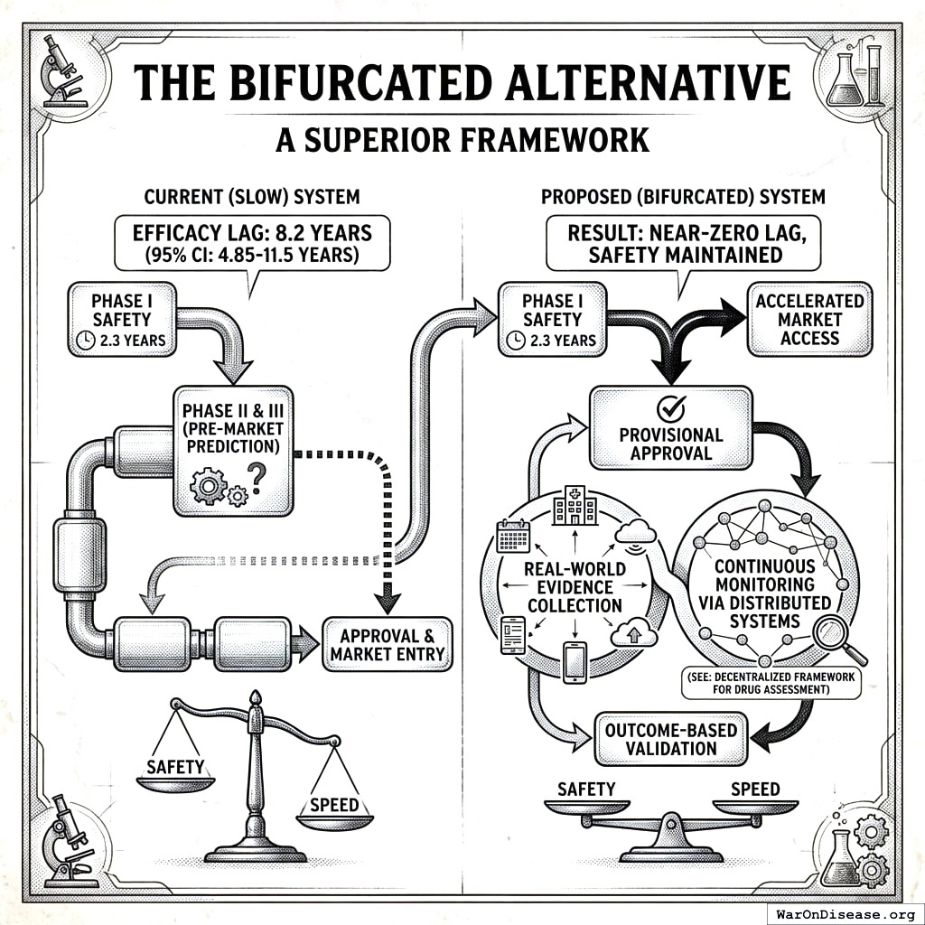 This study quantifies the cumulative mortality and morbidity costs associated with the Unitary Pre-Market Approval (UPMA) model mandated by the 1962 Kefauver-Harris Amendments. By enforcing efficacy testing prior to market entry, the current regulatory framework imposes an average “Efficacy Lag” of 8.2 years (95% CI: 4.85 years-11.5 years) post-safety verification.