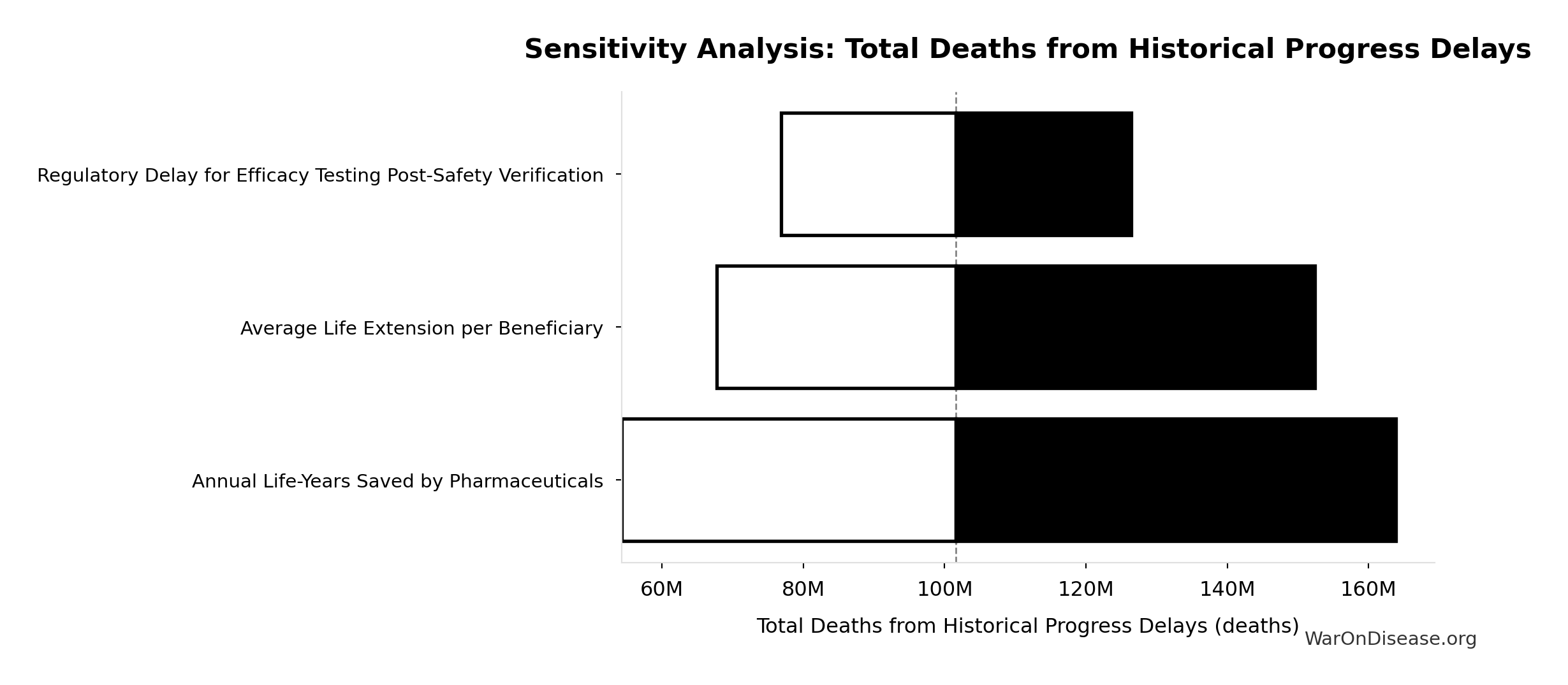 Historical mortality (1962-2024): Approximately 102 million people died waiting for approved drugs during their 8.2 years (95% CI: 4.85 years-11.5 years) approval delays. This is a lower bound - it excludes drugs never developed due to cost barriers.