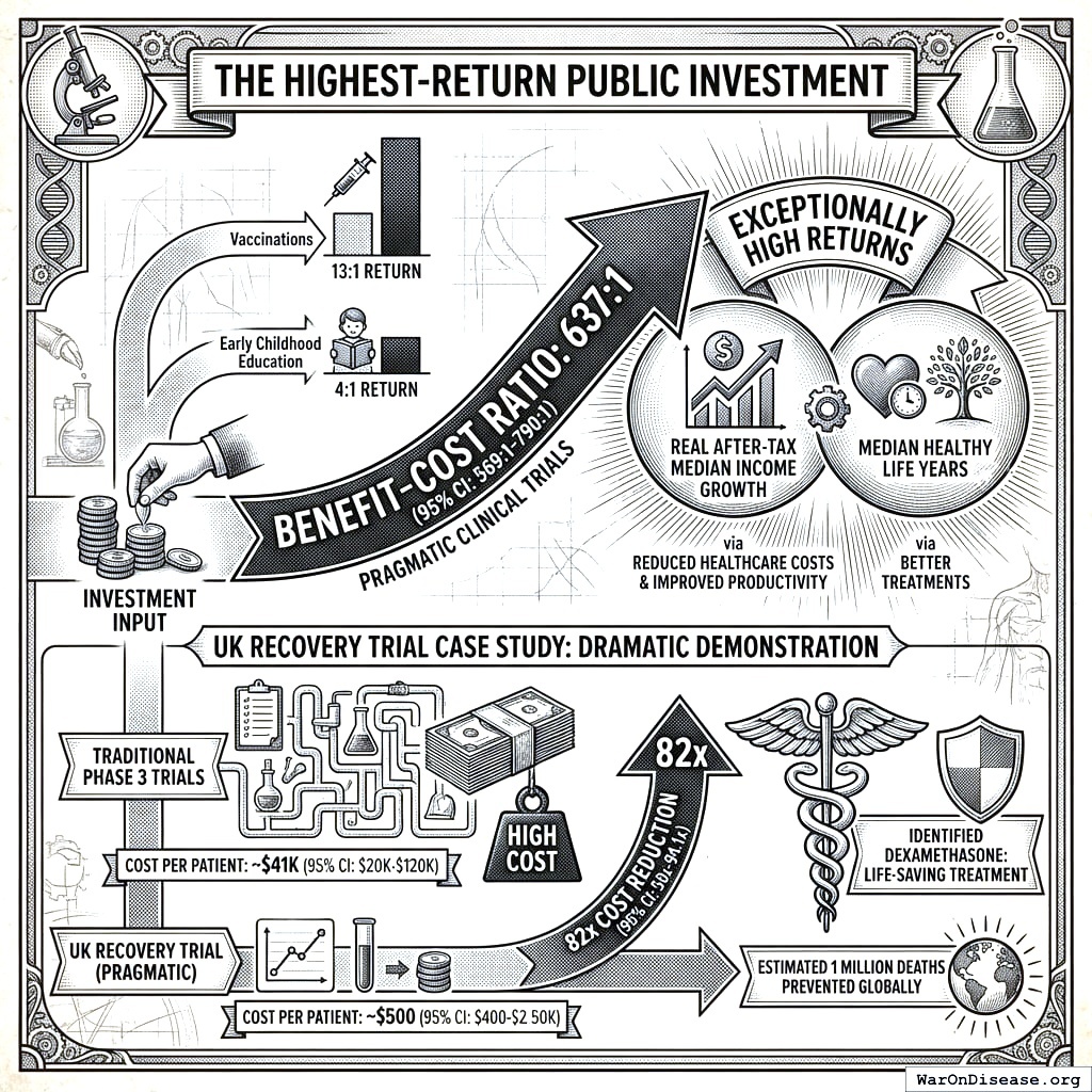 The result: systematic overinvestment in low-return categories and underinvestment in high-return categories. Historical examples demonstrate the scale of missed opportunities: the smallpox eradication campaign returned an estimated 450:1 ROI102, yet similar high-return public health investments remain chronically underfunded.