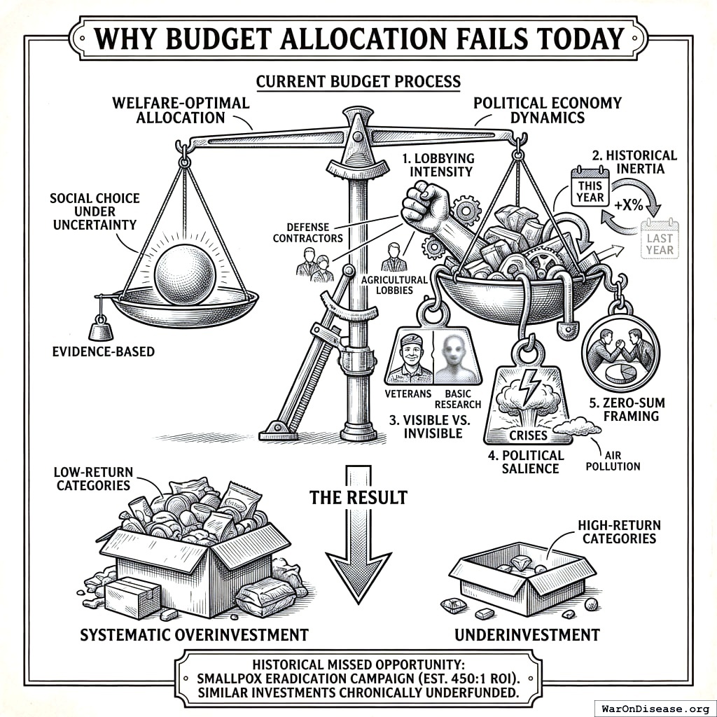 Budget allocation is fundamentally a problem of social choice under uncertainty148. The challenge is not simply technical but institutional: current budget processes systematically diverge from welfare-optimal allocations due to political economy dynamics149,150.