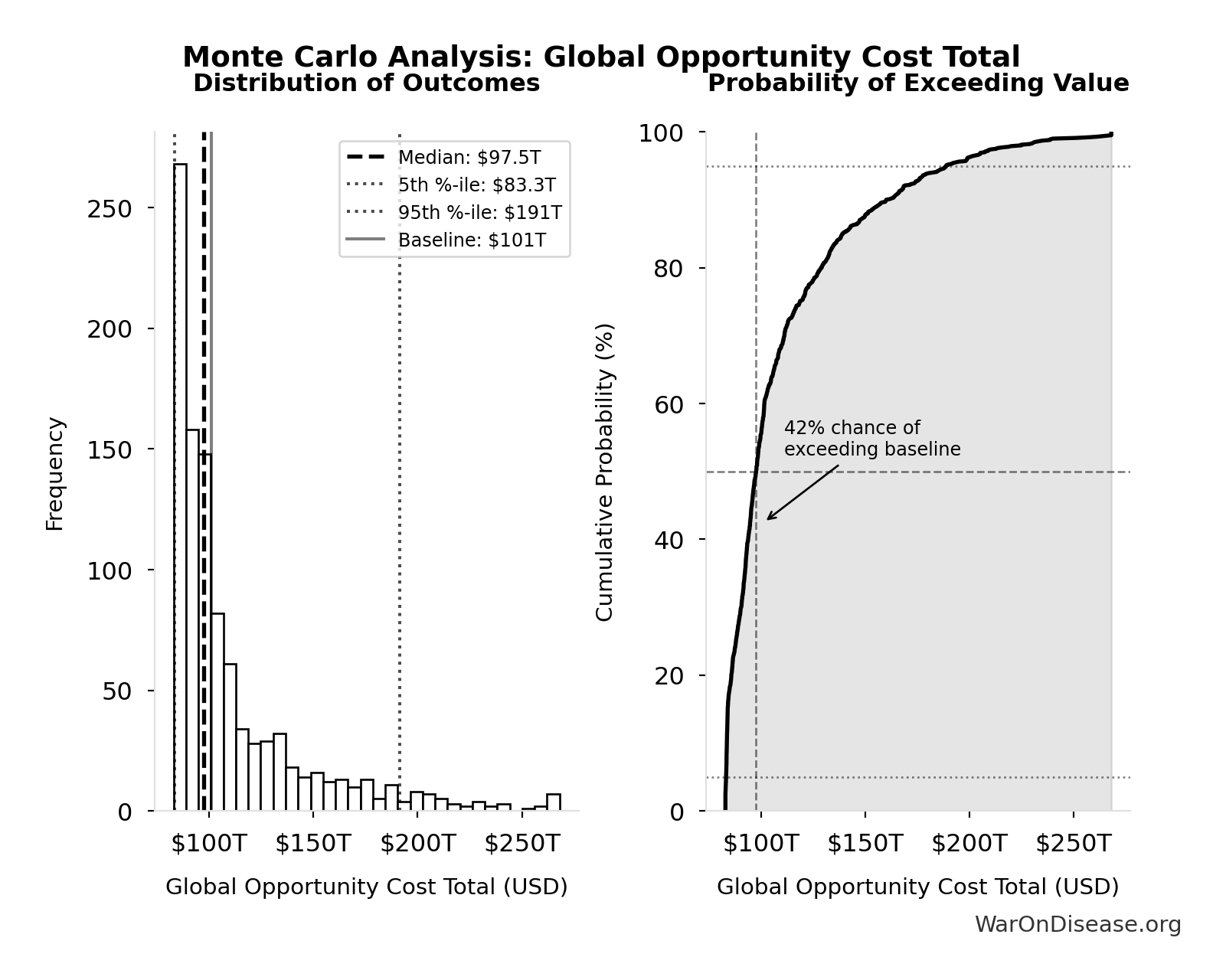 The histogram shows the distribution of Total Annual Decentralized Framework for Drug Assessment Operational Costs across 10,000 Monte Carlo simulations. The CDF (right) shows the probability of the outcome exceeding any given value, which is useful for risk assessment.