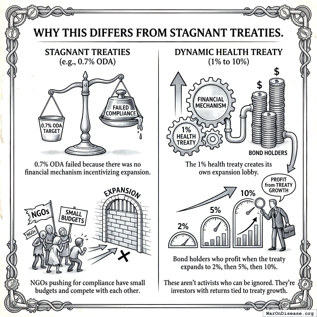 The 1% health treaty creates its own expansion lobby. Bond holders profit when the treaty expands to 2%, then 5%, then 10%. These aren’t activists you can ignore at a dinner party. They’re investors with quarterly earnings calls about curing diseases. They have Bloomberg terminals. They have lobbyists. They have the same tools that weapons manufacturers currently use to expand military budgets, except pointed in the opposite direction.