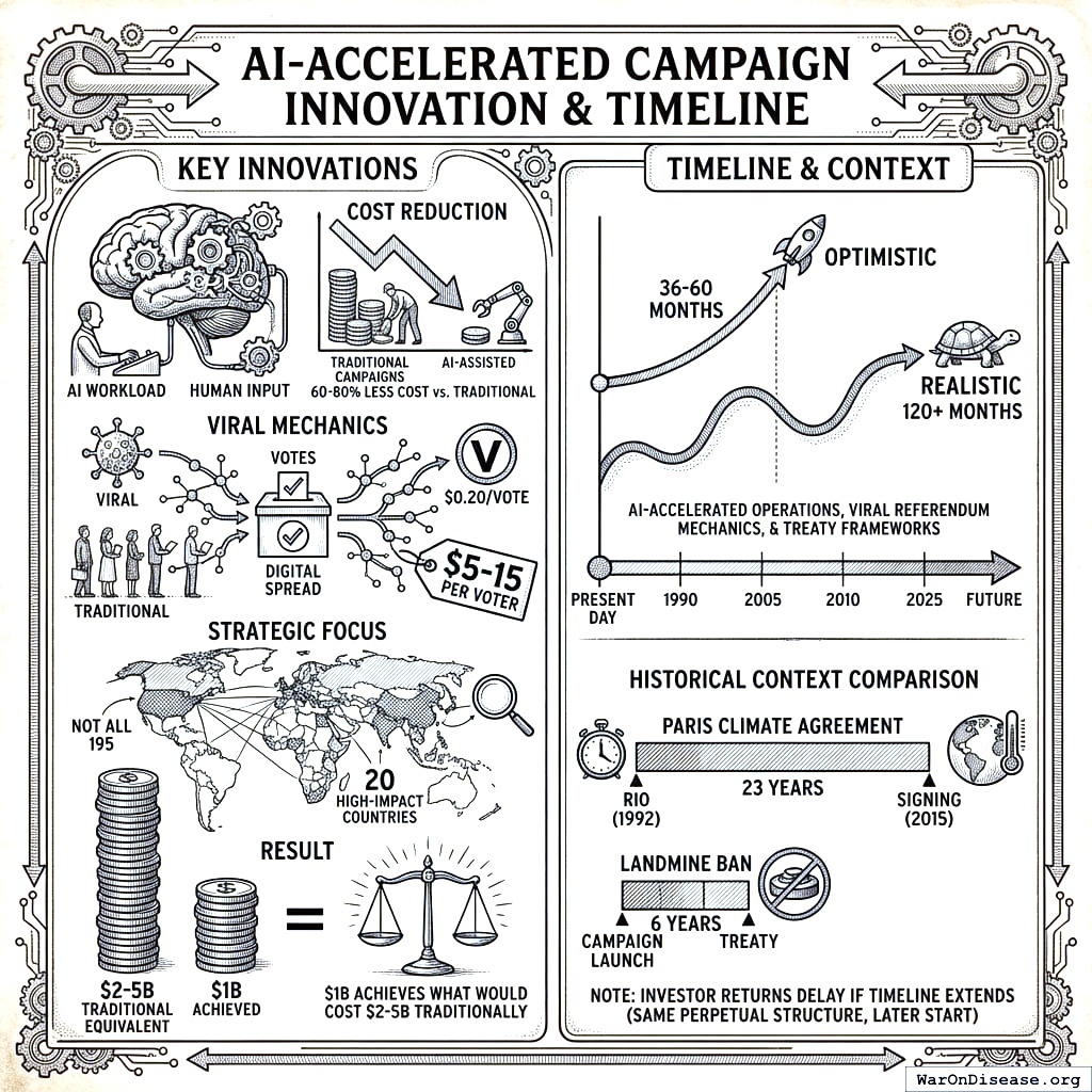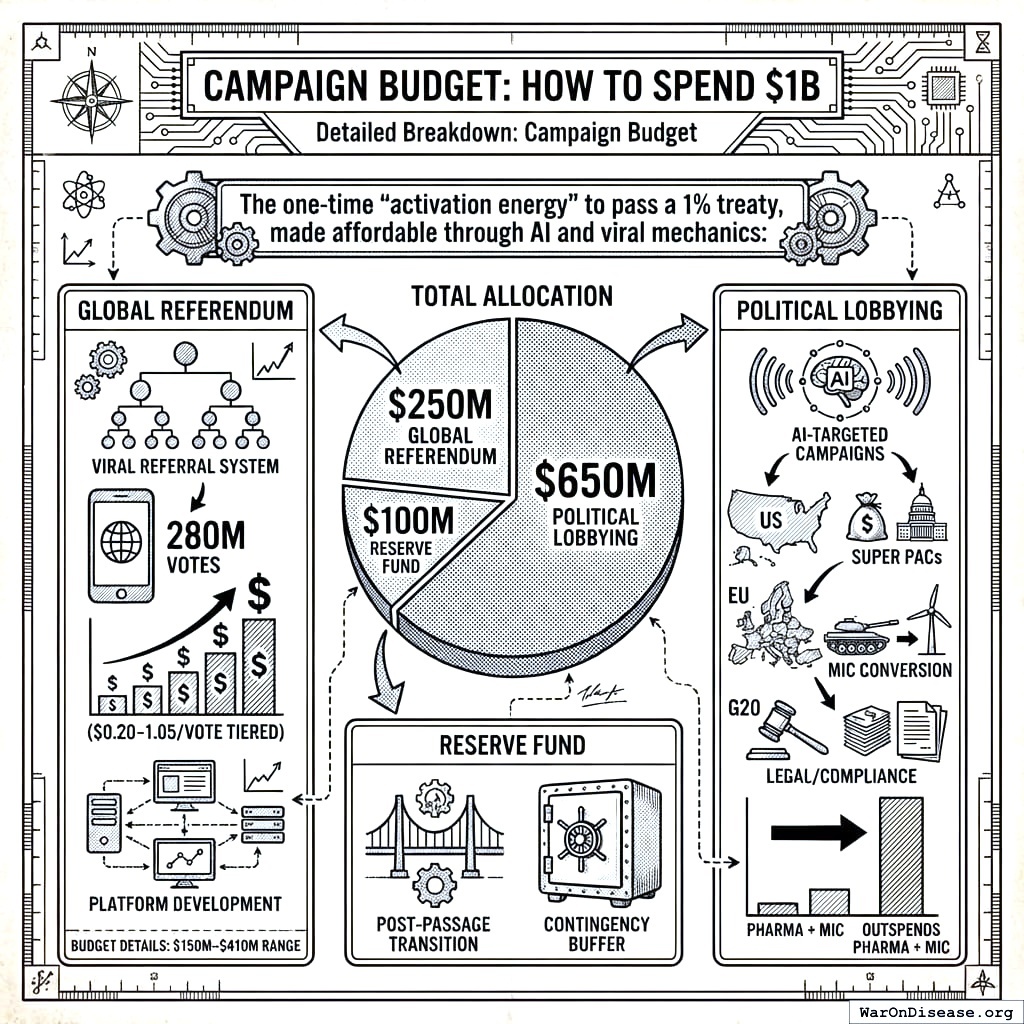 Why $1 billion? Your opposition spends $450M/year to keep things exactly as terrible as they are (pharma lobbying at roughly $300M/year plus the military-industrial complex at roughly $150M/year). A subscription to suffering. You raise $1 billion ONCE to pass a treaty that generates $27.2 billion/year FOREVER. Over a 10-year campaign, opposition spends roughly $4.5B to your $1B. But their $450M/year is spread across thousands of contracts and dozens of incumbents. Your $1B is aimed at a single treaty. Concentrated offense beats diffuse defense. This is military strategy, which is ironic, and also the only kind of strategy your species respects.