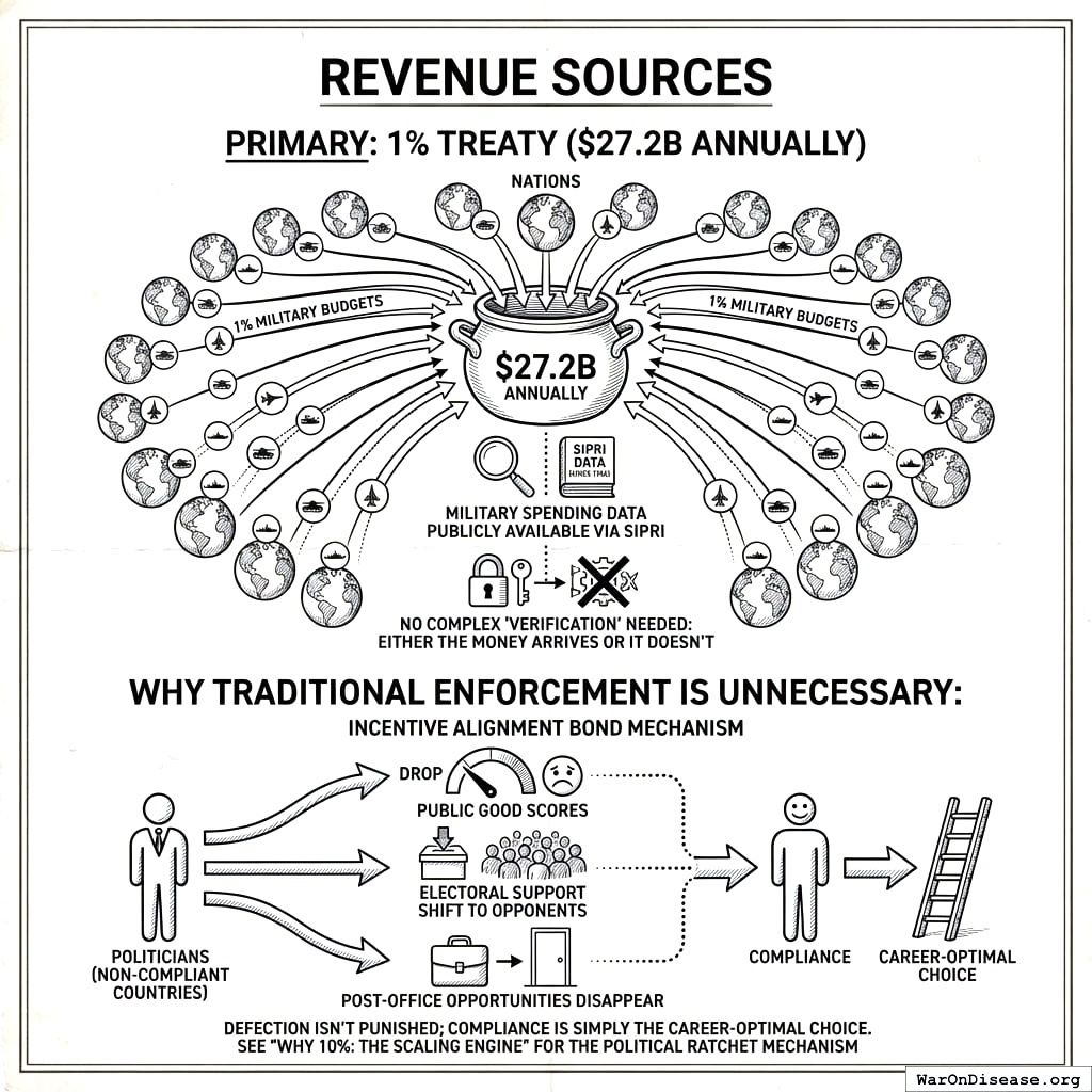 100+ nations contribute 1% of military budgets. Not because they’ve had a moral awakening. Because the Incentive Alignment Bond mechanism makes compliance self-enforcing: politicians in non-compliant countries watch their Treaty Support Scores fall, the 1% Treaty146-specific subtype of the Public Good Score, independent PACs redirect millions in campaign funding to their opponents, and their post-office career options shrink from WHO boards to writing memoirs nobody reads. Compliance becomes the career-optimal choice. You don’t need politicians to be good. You just need them to be selfish in the right direction.