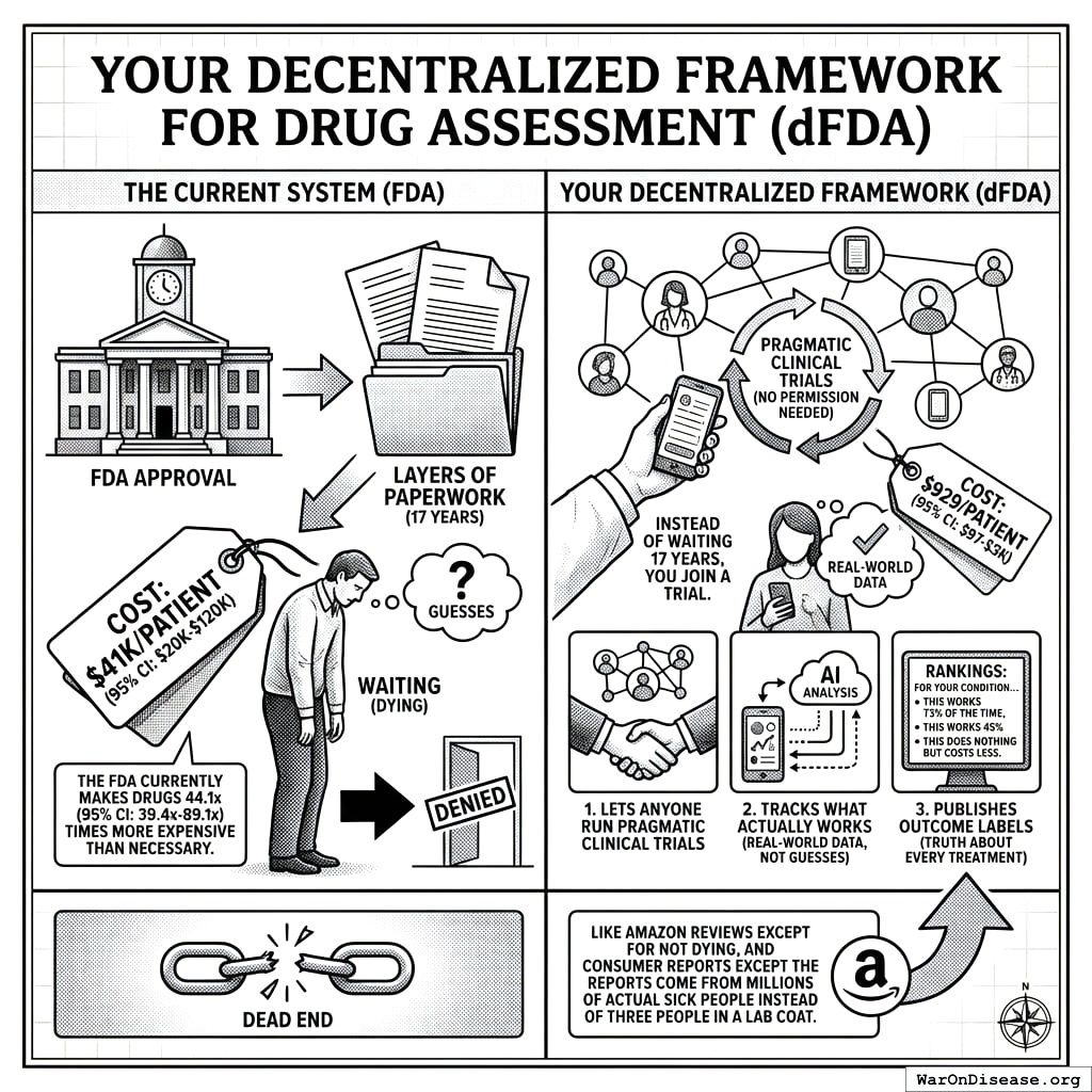 Instead of waiting 14 years (95% CI: 12 years-17 years) from discovery to patient while you die, you join a trial. It costs $929 (95% CI: $97-$3,000) instead of $41,000 (95% CI: $20,000-$120,000). You report outcomes through your phone. The AI analyzes millions of data points. The framework publishes rankings: “For your condition, this works 73% of the time, this works 45%, this does nothing but costs less.”