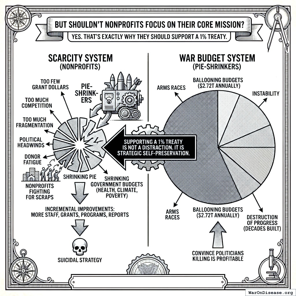 Every nonprofit today operates inside a system that guarantees their failure. Too few grant dollars. Too much competition for those dollars. Shrinking government budgets for health, climate, and poverty. Ballooning budgets for war. Donor fatigue (your donors are tired because you keep asking them for money to do things that don’t work because you don’t have enough money). And the people whose job is “convince politicians that killing is profitable” get $2.72 trillion annually to make your job harder.