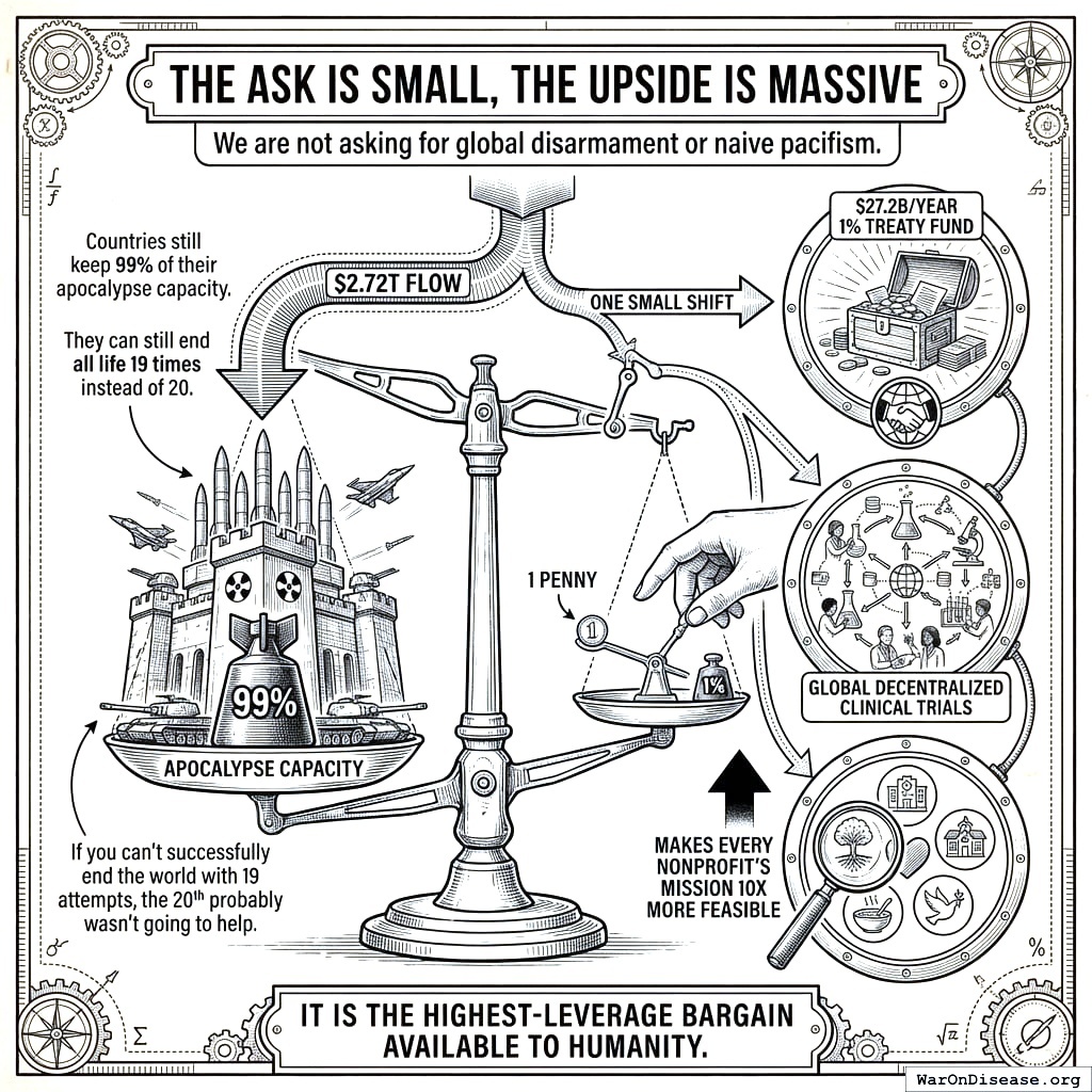 10.5281/zenodo.18161560 6.65 thousand diseases have zero FDA-approved treatments; at current trial capacity, exploring them takes 443 years. Redirecting 1% of military spending scales capacity 12.3x, cutting the timeline to 36 years and preventing 10.7 billion deaths. At $0.00177/DALY, 50.3kx more cost-effective than the best existing interventions. Incentive Alignment Bonds make adoption politically viable.