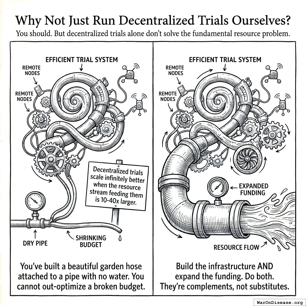 Your clinical trial infrastructure becomes 12.3x (95% CI: 4.2x-61.4x) more useful when the resource stream feeding it is 10 times larger. You cannot out-engineer a funding problem. Build the hose AND turn on the water. They’re complements, not substitutes.