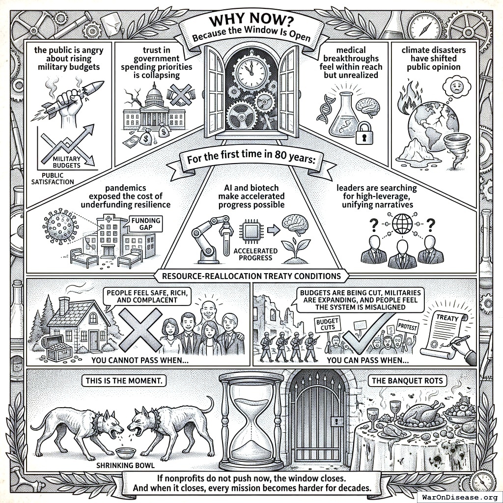 You have two options. Option A: keep competing for finite grants forever, writing proposals, begging foundations, hoping your competitor doesn’t write a better proposal. Option B: help pass the treaty, get paid referral bonuses for every verified referendum vote you drive, and watch $27.2 billion/year flow to your disease area. One involves begging. The other involves getting paid. On Wishonia, this would not require a chapter to explain. But your species is very attached to its suffering, so here we are.
